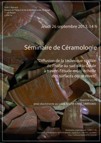 Le 26 septembre 2013 à 14 h, Yoanna LEON (post-doctorante au LAPA-SIS2M, CNRS UMR5060) animera le prochain séminaire de céramologie organisé par l'Equipe 2 : " Diffusion de la technique sigillée de l'Italie au sud de la Gaule à travers l'étude multi-échelle des surfaces décoratives ".
