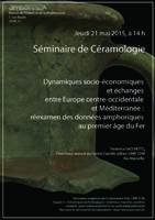 Federica SACCHETTI, chercher associé au CCJ (UMR 7299, Aix-Marseille), présentera ses travaux sur les "dynamiques socio-économiques et échanges à longue distance entre Europe centre-occidentale et Méditerranée : réexamen des données amphoriques et analyse de la mobilité des conteneurs et contenus au premier âge du Fer (VIe-Ve s. av. J.-C.)".
