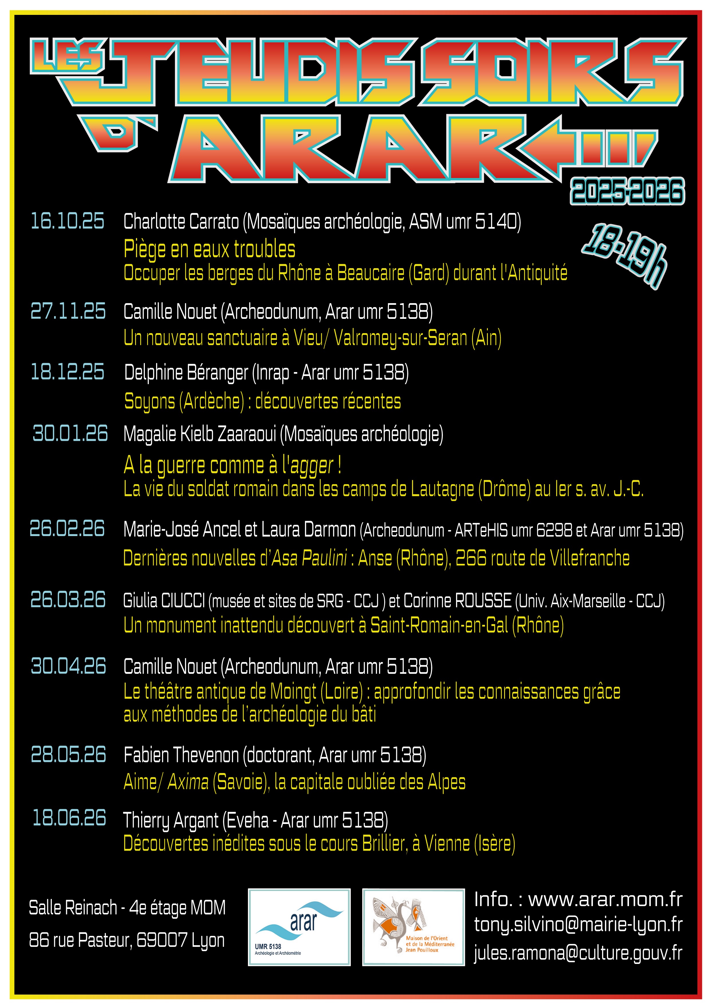 Retrouvez le programme complet des jeudis soir d'ArAr 2025-2026 dans le cadre des rencontres mensuelles de l’axe 1 – thème 2 du laboratoire ArAr « Réseaux et dynamiques d’occupations antiques, IIe s. av – Ve s. apr. J.-C.